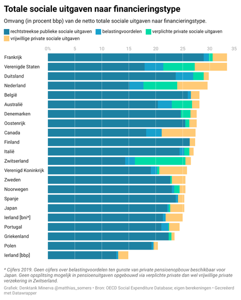 In Zwitserland eisen verplichte private sociale uitgaven bijna een tiende van het bbp op, in Nederland meer dan 6 procent, in de Verenigde Staten bijna 6 procent, en in Australië bijna 4 procent.