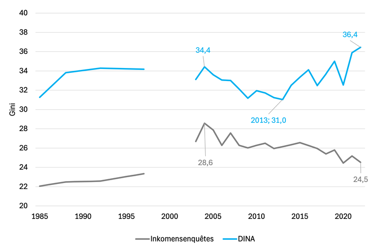 In figuur 1 vergelijken we de evolutie van inkomensongelijkheid op basis van de vaak gebruikte inkomensenquêtes (grijze lijn) met de evolutie die we bekomen op basis van de DINA-methode (blauwe lijn). We gebruiken voor beide reeksen een vergelijkbaar inkomensconcept: het beschikbaar gezinsinkomen dat gecorrigeerd werd voor gezinsgrootte aan de hand van een equivalentieschaal.