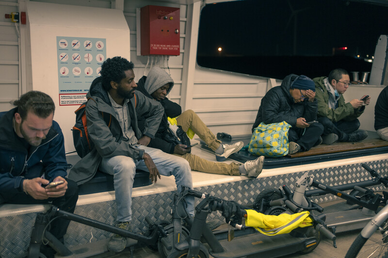 Vrijdagavond, 22 uur in de Antwerpse haven. Het is intussen donker en de middagshift bij havenbedrijf Katoen Natie zit erop. De waterbus zit nokvol met mannen en hier en daar een enkele vrouw. ‘Pas de Belges ici’, vertelt de 27-jarige Manon uit Spanje. Ook zij werkt met weekcontracten en moet haar ritjes met de waterbus zelf betalen.