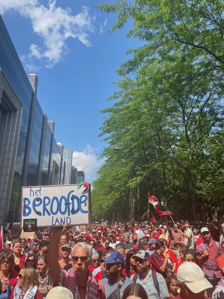 'Draag iets roods', was het devies. De kilometerslange rode lijn die de organisatoren van de betoging wilden trekken naar het eindpunt op het Jean Reyplein werd zo fysieke werkelijkheid. 'Duizenden burgers, organisaties, vakbonden, ngo's en het brede middenveld vormen één rode mensenketting', klonk het. 'We staan zij aan zij. Tegen genocide. Tegen etnische zuivering. Tegen honger als wapen en moord als beleid. Tegen Europese regeringen die toekijken en zelfs bijdragen aan oorlogsmisdaden.'