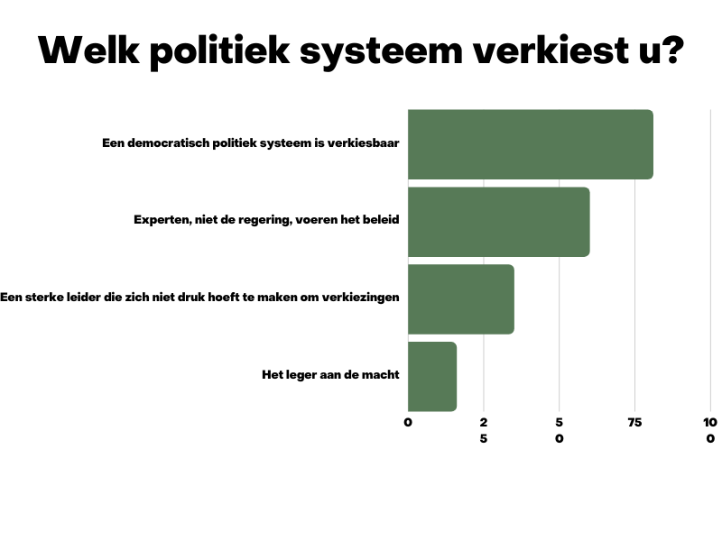 Dat wantrouwen uit zich in een groeiend en zorgwekkend draagvlak voor minder democratische bestuursvormen. Nog steeds 81 procent van de Vlamingen verkiest de democratie, maar ruim een derde heeft liever ‘een sterke leider zonder dat die zich druk moet maken om het parlement en verkiezingen’. 16 procent ziet zelfs graag het leger het land besturen, en 60 procent wil liever ‘experts’ dan democratisch verkozen bewindvoerders in de cockpit.