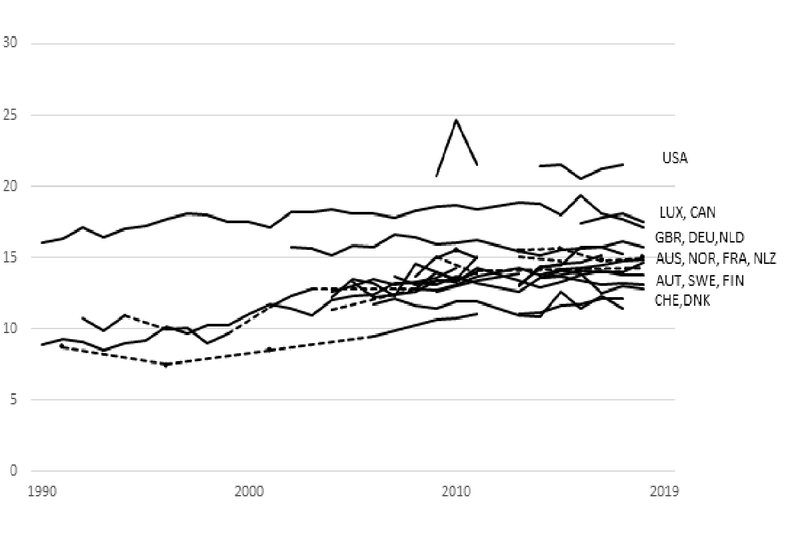 Lage lonen blijven structureel achter op productiviteitsstijgingen en mediaaninkomens, dat is een algemeen trend in rijke welvaartsstaten. In België liep het minimumloon een groeiende achterstand op bij de gemiddelde lonen en bij de productiviteit. We weten dat het verband tussen het niveau van de minimumlonen en de armoede niet zo sterk is, veel lage loontrekkers leven immers in gezinnen waar er nog andere inkomens zijn. Maar onrechtstreeks – door de impact op de sociale minimumuitkeringen – is de trage groei van de lage lonen wél van groot belang om de opgaande armoedetrends te begrijpen.