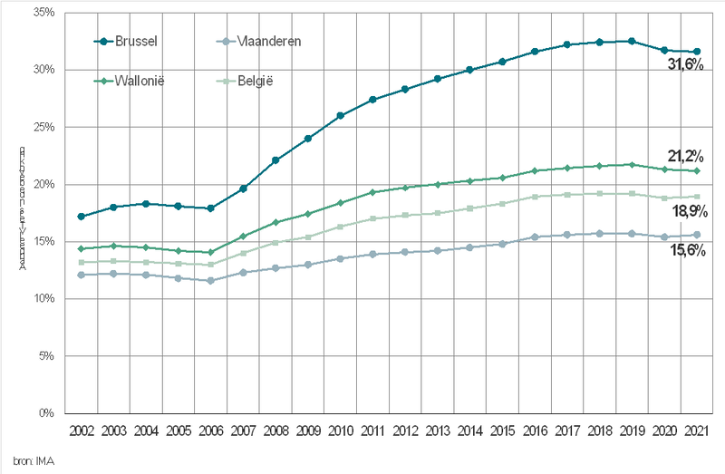 Volgens gegevens van het Intermutualistisch Agentschap (IMA) steeg het aantal VT’ers in België tussen 2002 en 2021 van 1.385.000 tot 2.137.000. Dat is een toename van 54 procent. Uitgedrukt als percentage van de totale bevolking gingen we van 13,2 procent in 2002 naar 18,9 procent in 2021. Dat aandeel ligt in die periode altijd hoger in Brussel (31,6 procent in 2021) en Wallonië (21,2 procent), dan in Vlaanderen (15,6 procent). Vooral sinds 2007 is er een aanzienlijke stijging.