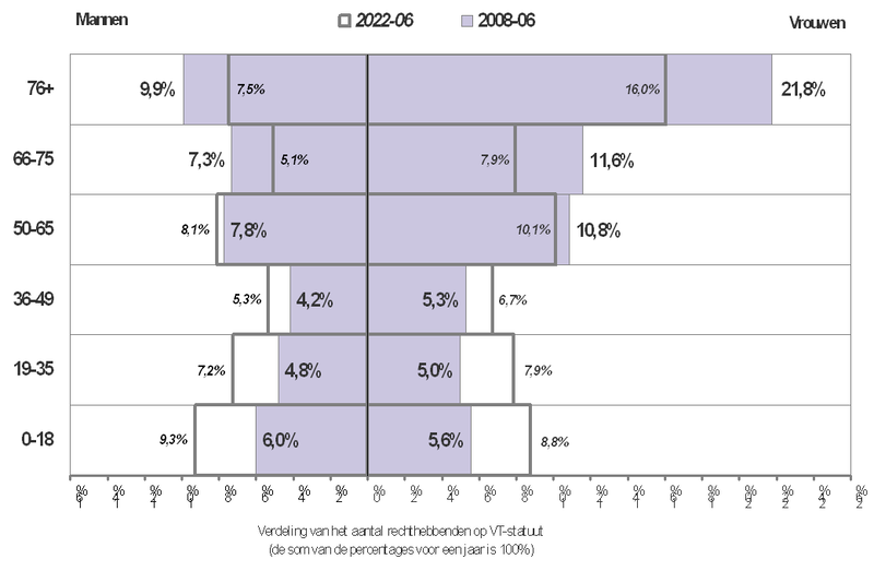 De verjonging van de VT-populatie is duidelijk waar te nemen als we de opbouw van de leeftijdspiramide vergelijken voor de jaren 2008 en 2022 (figuur 3). In juni 2008 telden we 581.000 VT-leden: zo’n 31,7 procent was 76 jaar of ouder, 11,6 procent was 18 jaar of jonger. In juni 2022 bedroegen die percentages voor bijna 706.000 VT-leden respectievelijk 23,5 procent en 18,1 procent. De jongste drie leeftijdsgroepen (0-18, 19-35, 36-49) zijn in feite almaar sterker vertegenwoordigd, en de oudste twee (66-75, 76+) almaar minder sterk.