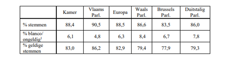 Tabel 1: Electorale deelname en blanco en ongeldige stemmen. (Bron: Pilet et al. (2020). De Belgen verheffen hun stem. Een analyse van het stemgedrag op 26 mei 2019. Louvain La Neuve, Presses Universitaires de Louvain.)